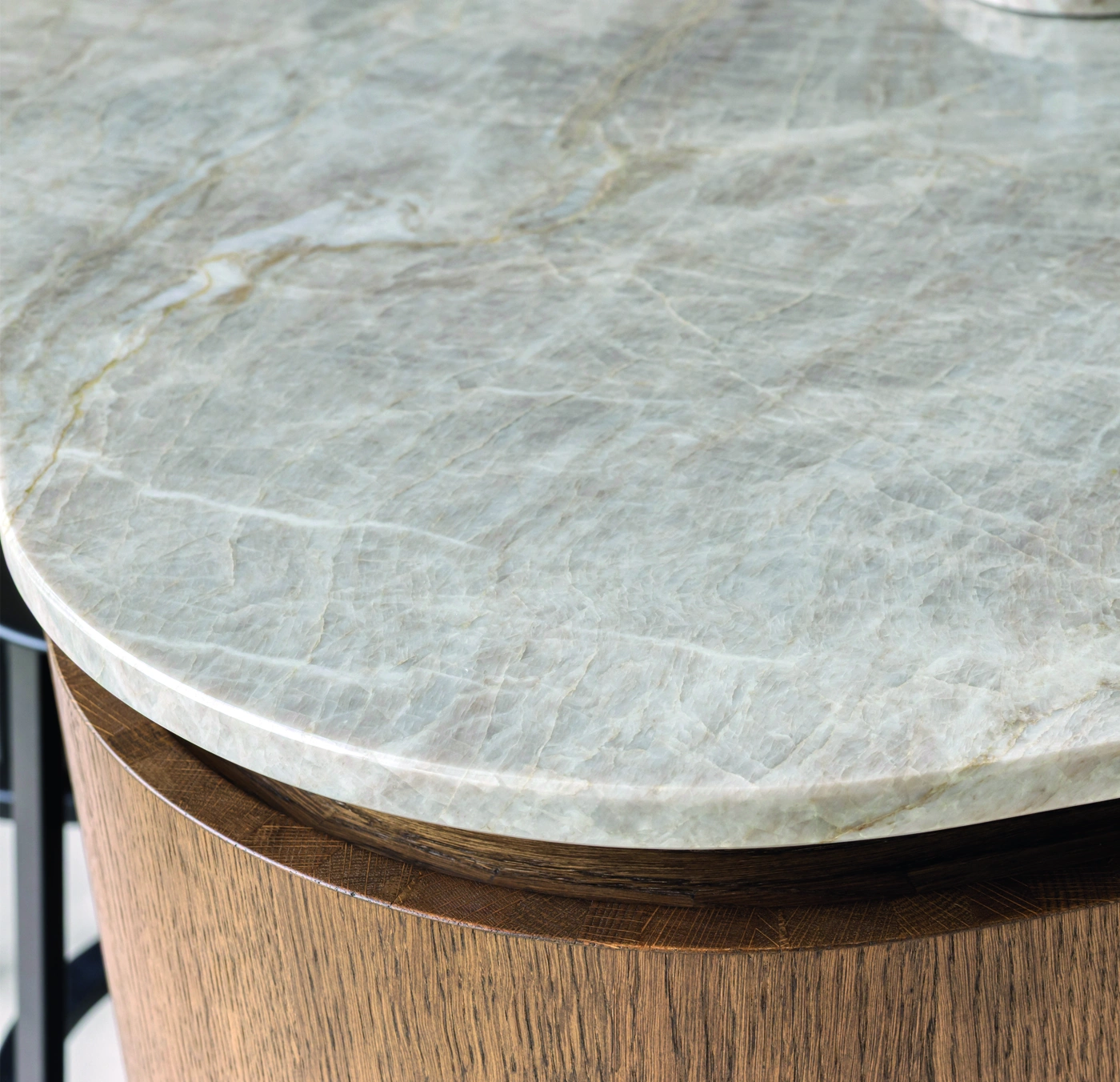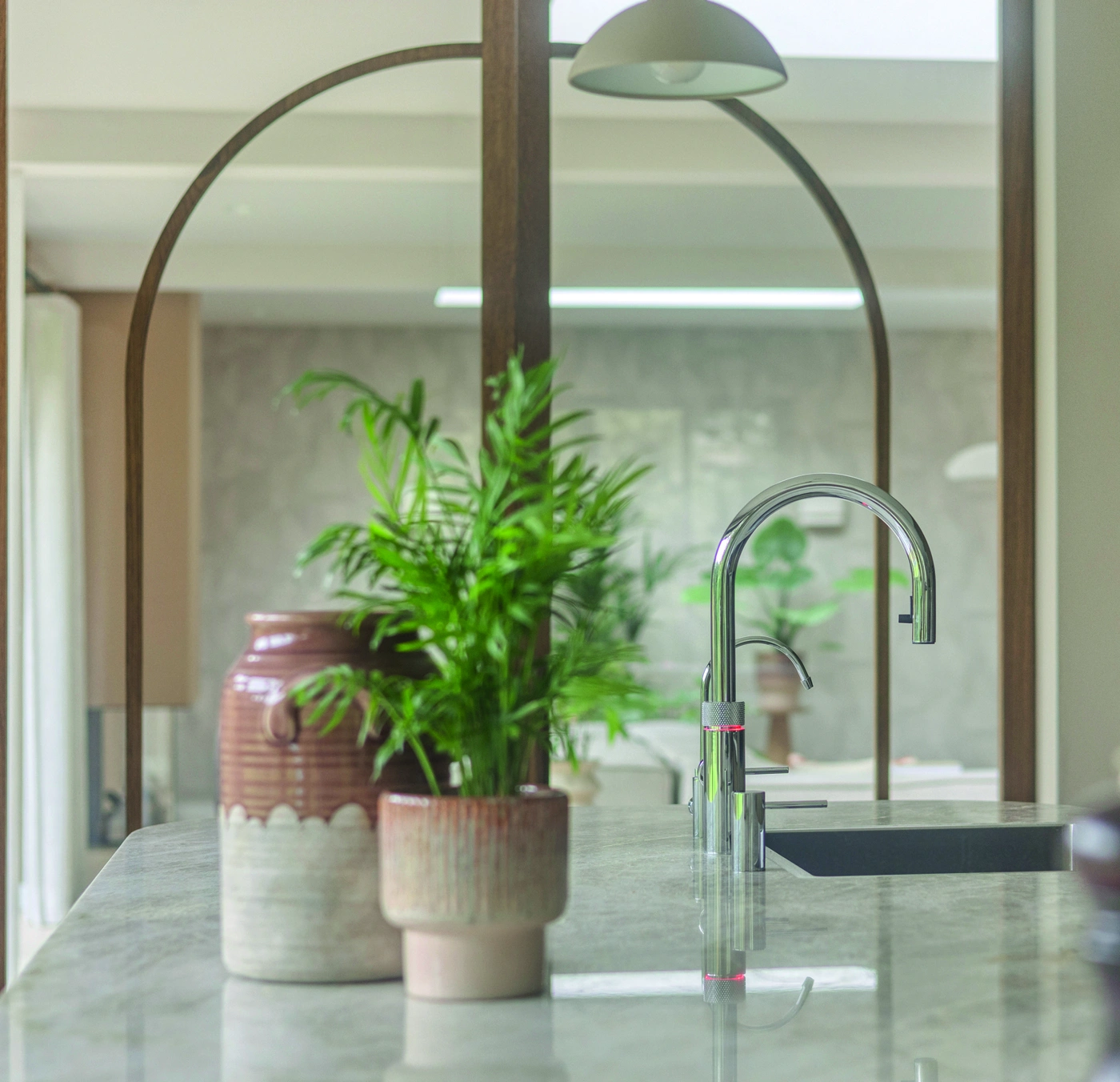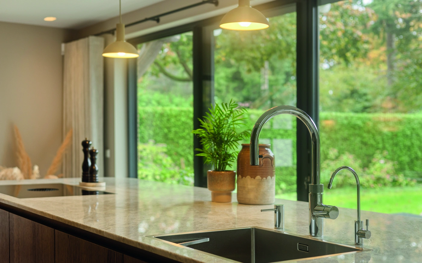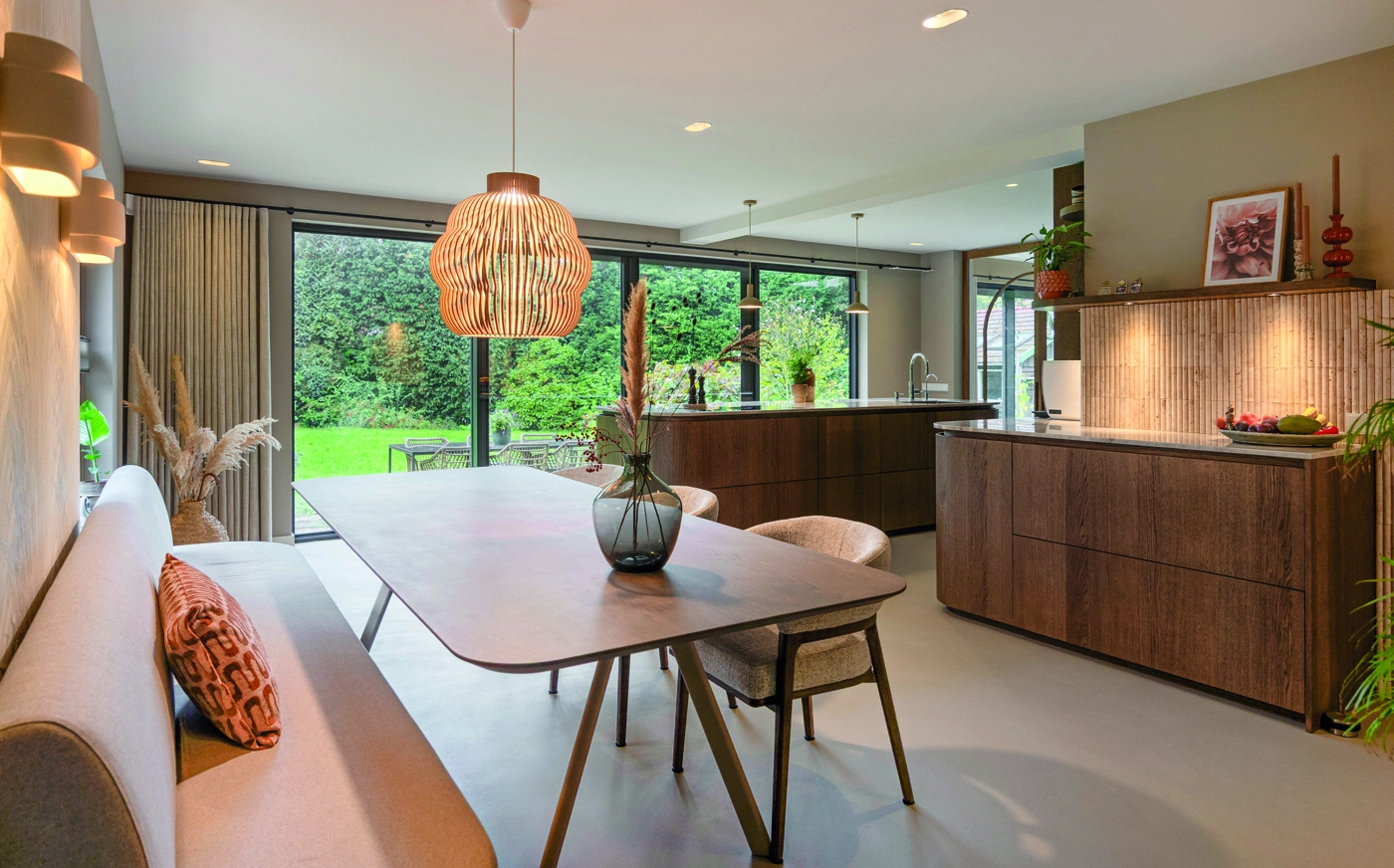 Prachtige houten keuken met ronde vormen en royaal kookeiland, voorzien van hoogwaardige Siemens-apparatuur en bijzonder mooi werkblad. Dit design is een echte eyecatcher, met aandacht voor detail, veel bergruimte en een warme, uitnodigende uitstraling voor elke keukenliefhebber.