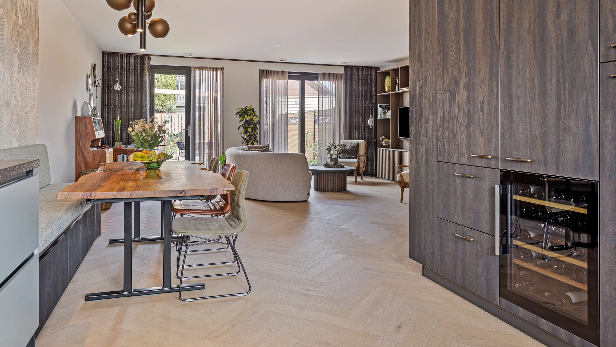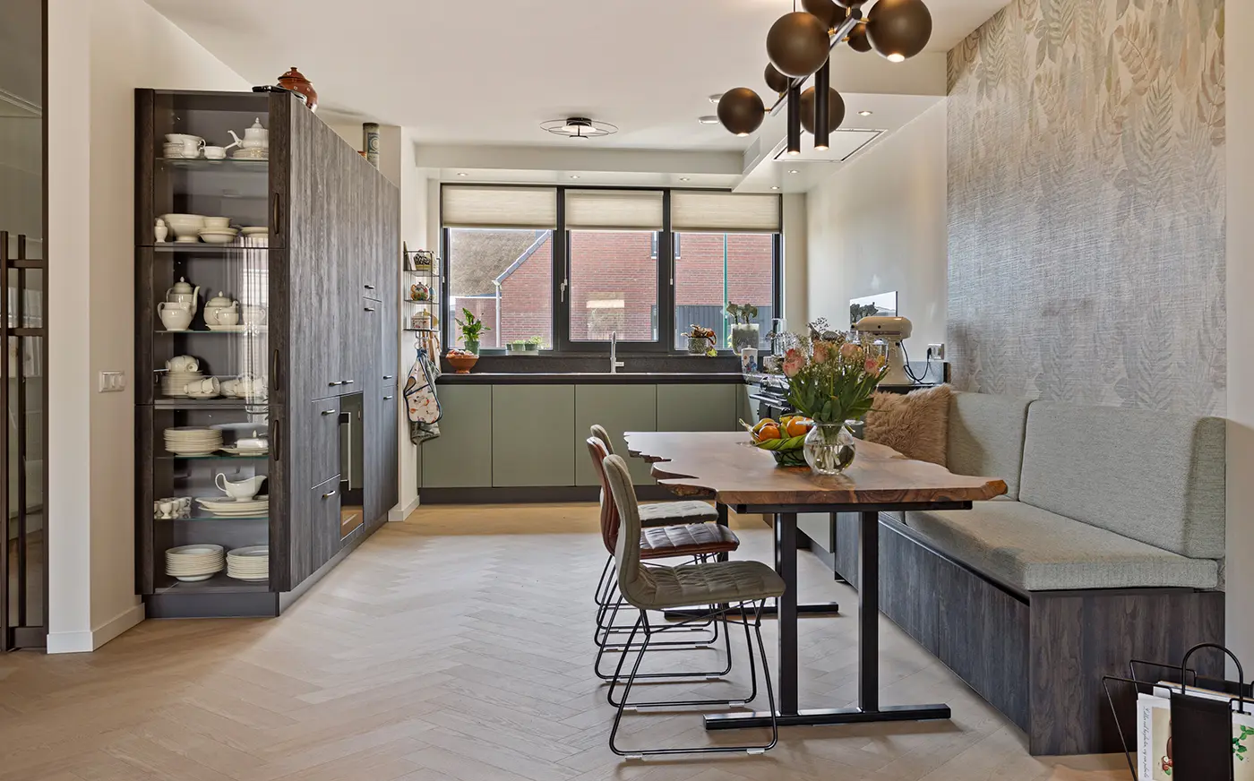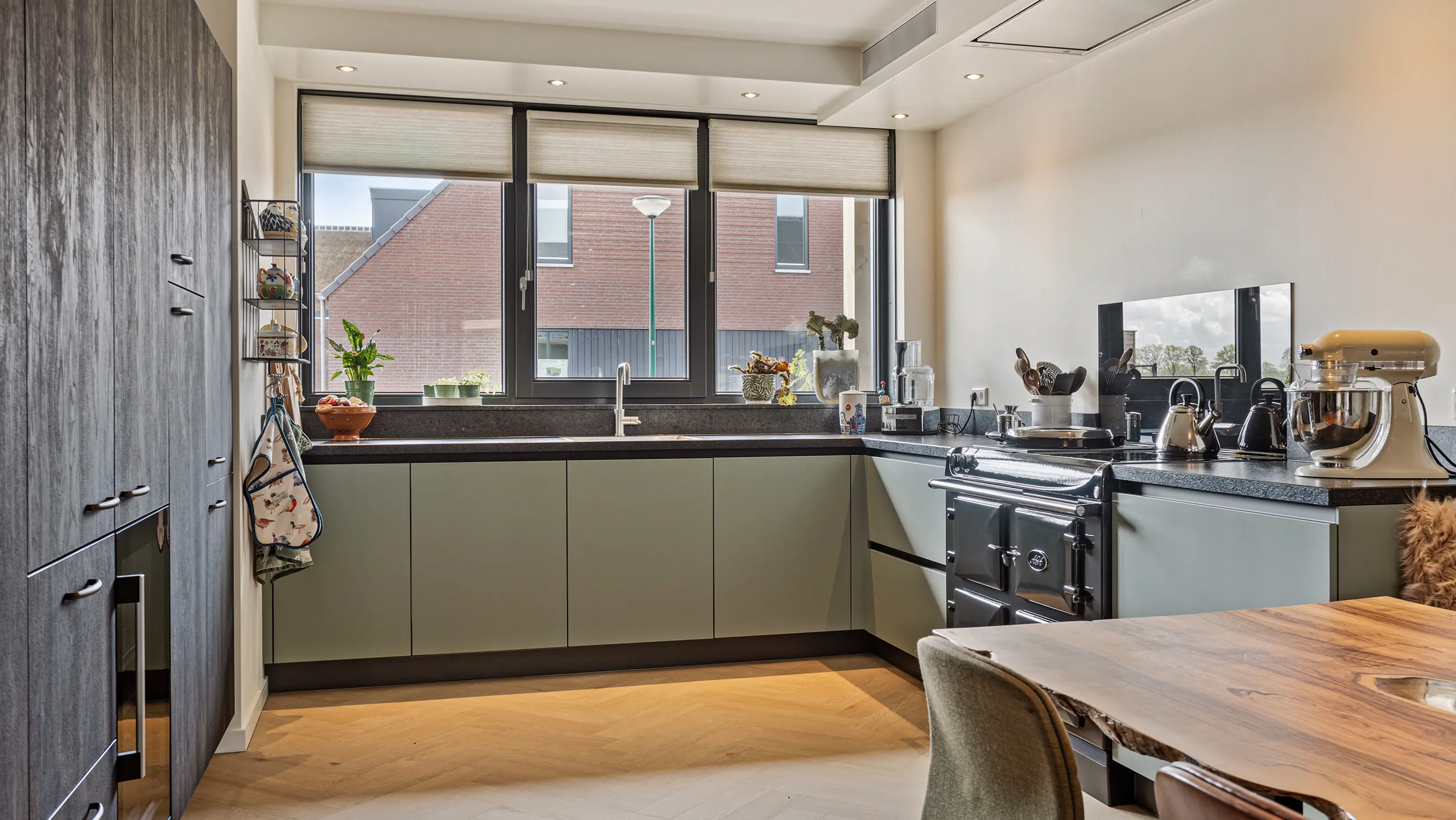 Deze sfeervolle hoekkeuken combineert zachtgroene fronten met een robuuste, houten kastenwand die zorgt voor een natuurlijke en industriële uitstraling. Het massieve, stalen fornuis vormt het hart van de ruimte, terwijl de geïntegreerde wijnklimaatkast en royale opbergruimte zorgen voor luxe en gemak. Een keuken waarin stijl en vakmanschap samenkomen en elke maaltijd een ontspannen moment wordt.