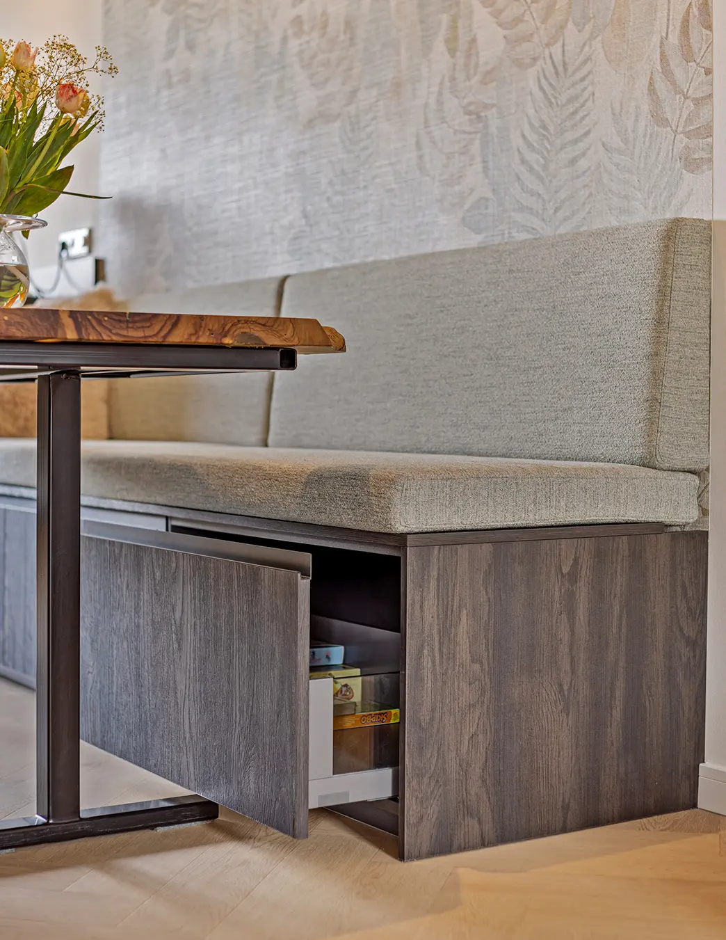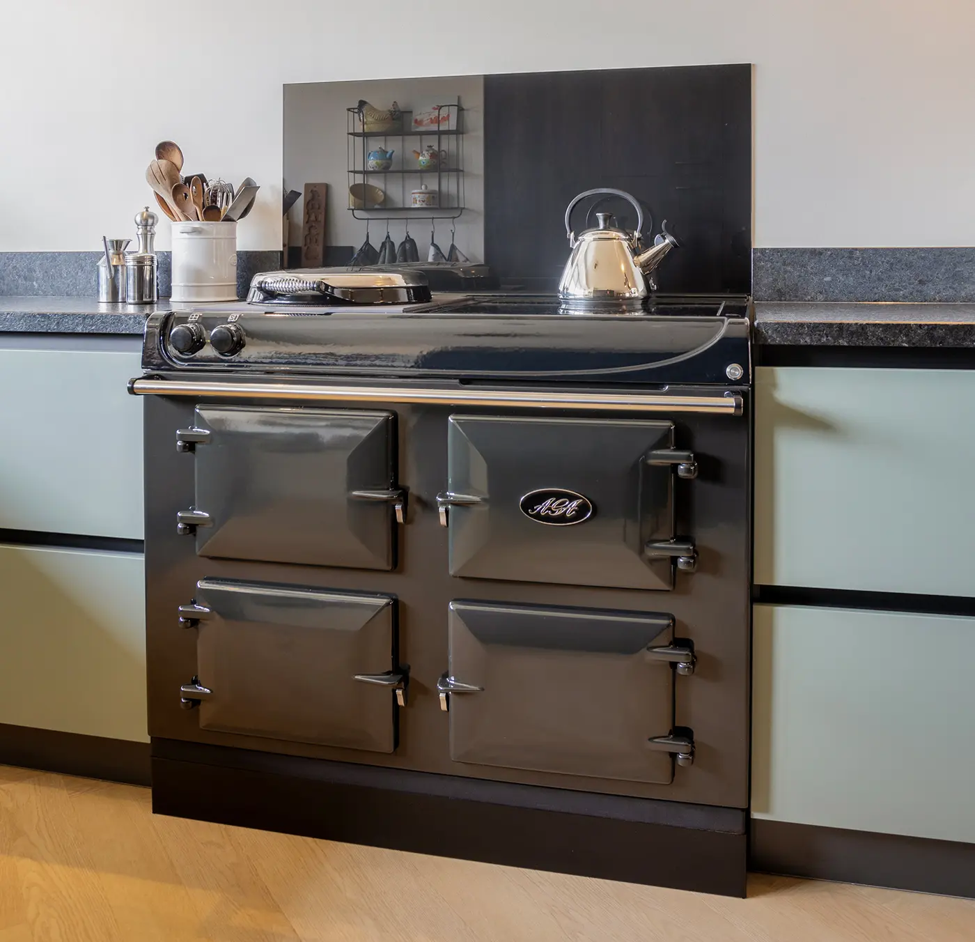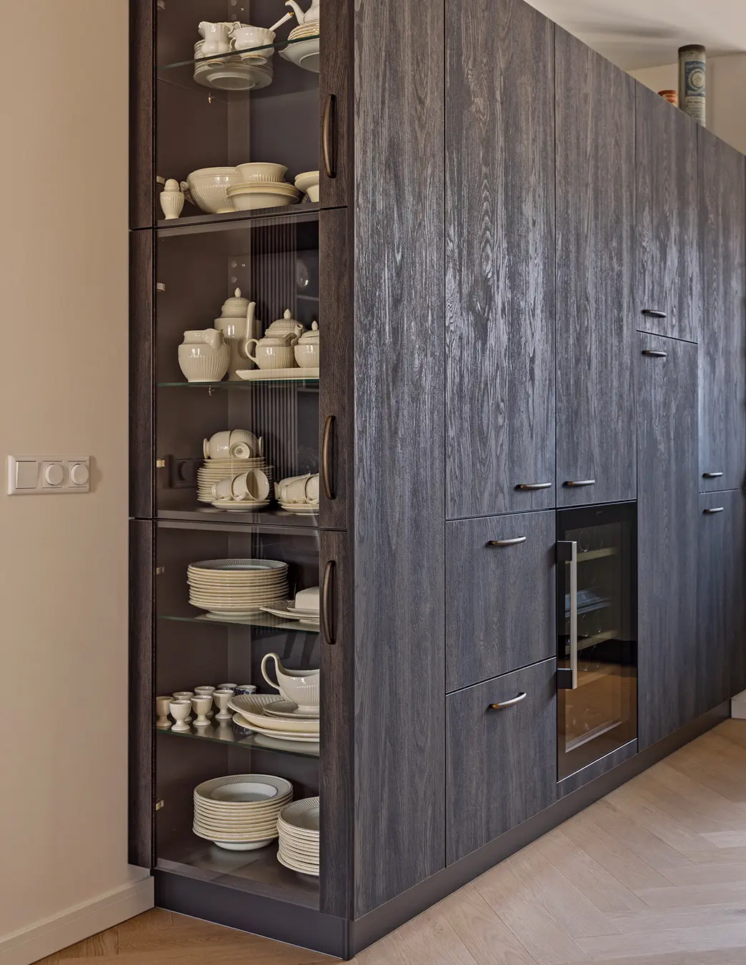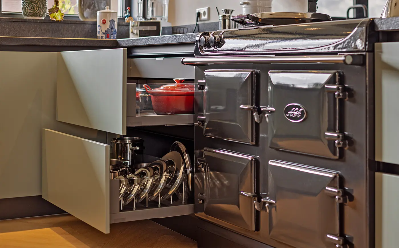 Deze sfeervolle hoekkeuken combineert zachtgroene fronten met een robuuste, houten kastenwand die zorgt voor een natuurlijke en industriële uitstraling. Het massieve, stalen fornuis vormt het hart van de ruimte, terwijl de geïntegreerde wijnklimaatkast en royale opbergruimte zorgen voor luxe en gemak. Een keuken waarin stijl en vakmanschap samenkomen en elke maaltijd een ontspannen moment wordt.