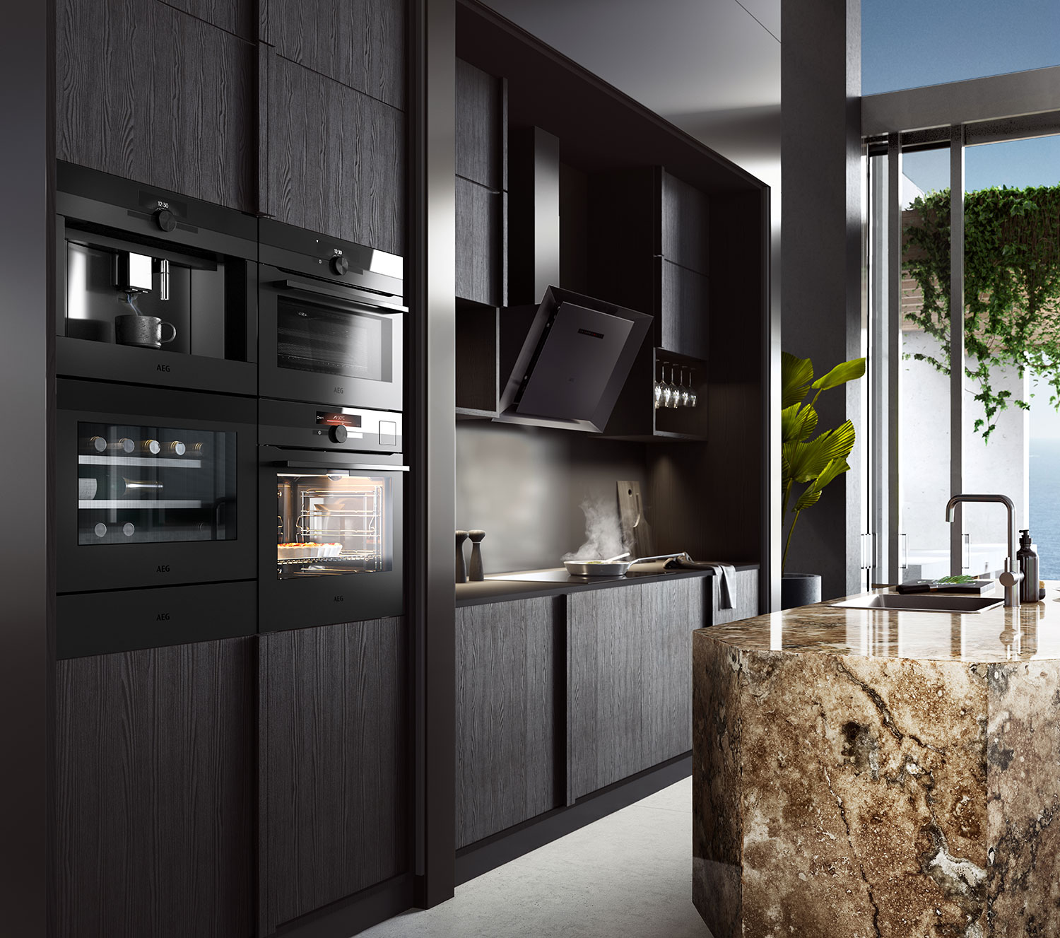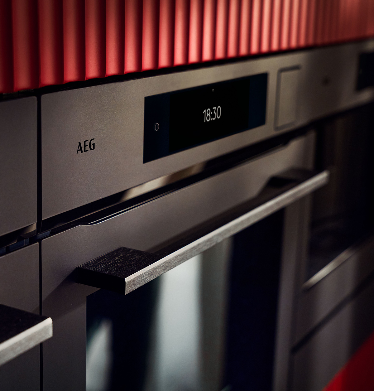 Mat zwarte oppervlakken en glas worden van oudsher in de keuken gebruikt, denk aan de zware, gietijzeren en geëmailleerde pannen waarin vroeger werd gekookt. In lijn met de laatste keukentrends – modern maar met een retro ‘look & feel’ – presenteert AEG de MattBlackLine. Dankzij het innovatieve productieproces vormt de matte textuur het glazen oppervlak. Dit maakt het materiaal niet alleen duurzaam – de mat zwarte afwerking is immers geen coating die kan slijten – maar geeft het ook een levendige uitstraling. Daarnaast is het, in tegenstelling tot gewoon glas, vlekvrij en dus niet alleen stijlvol maar ook heel praktisch. De MattBlackLine van AEG biedt een brede selectie modellen waarbij het gebruik van dit speciale mat zwarte glas wordt gecombineerd met andere premium materialen.