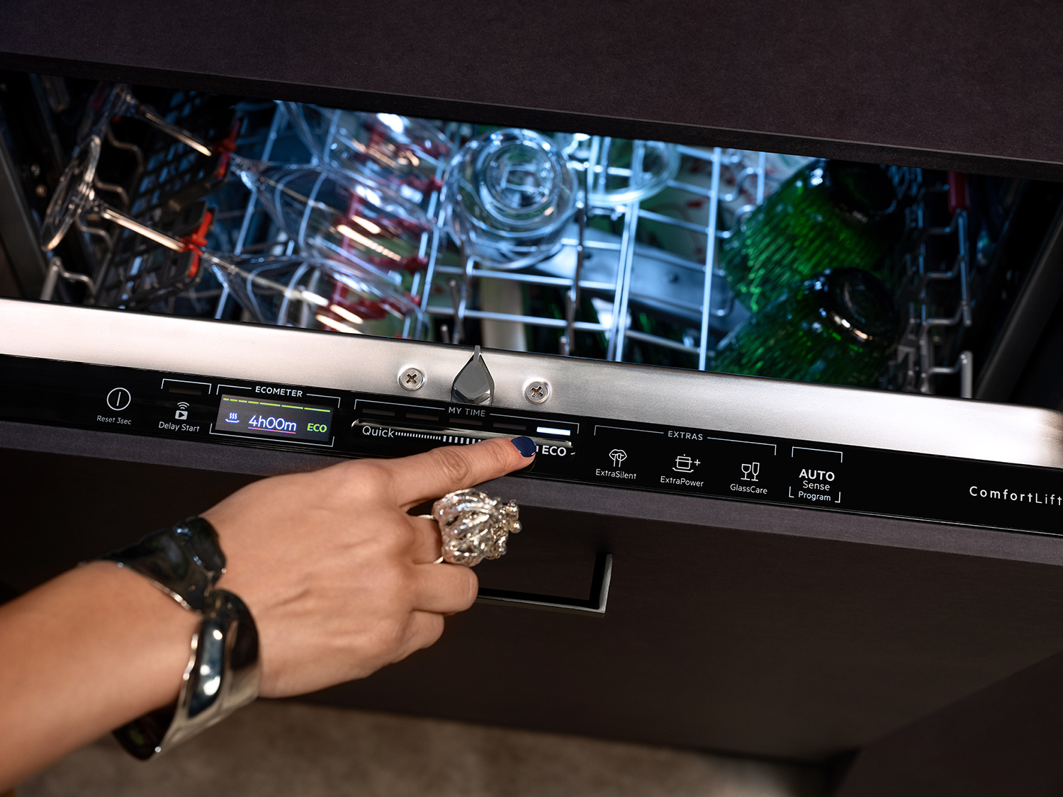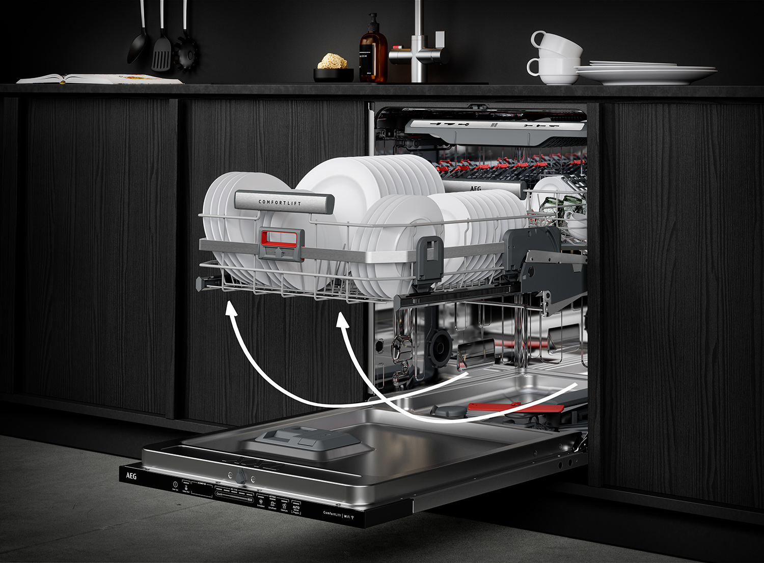 De AEG ComfortLift® vaatwasser is de eerste vaatwasser die dankzij de vernieuwde technologie ervoor zorgt – met belading – dat de vaat bij het uitrijden vanzelf omhoog komt. Zo kun je, zonder te bukken, efficiënter uitladen en doeltreffender inladen.
