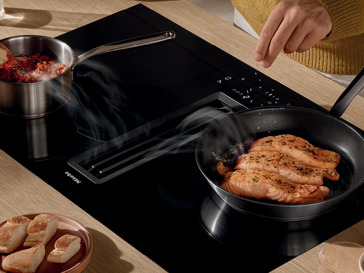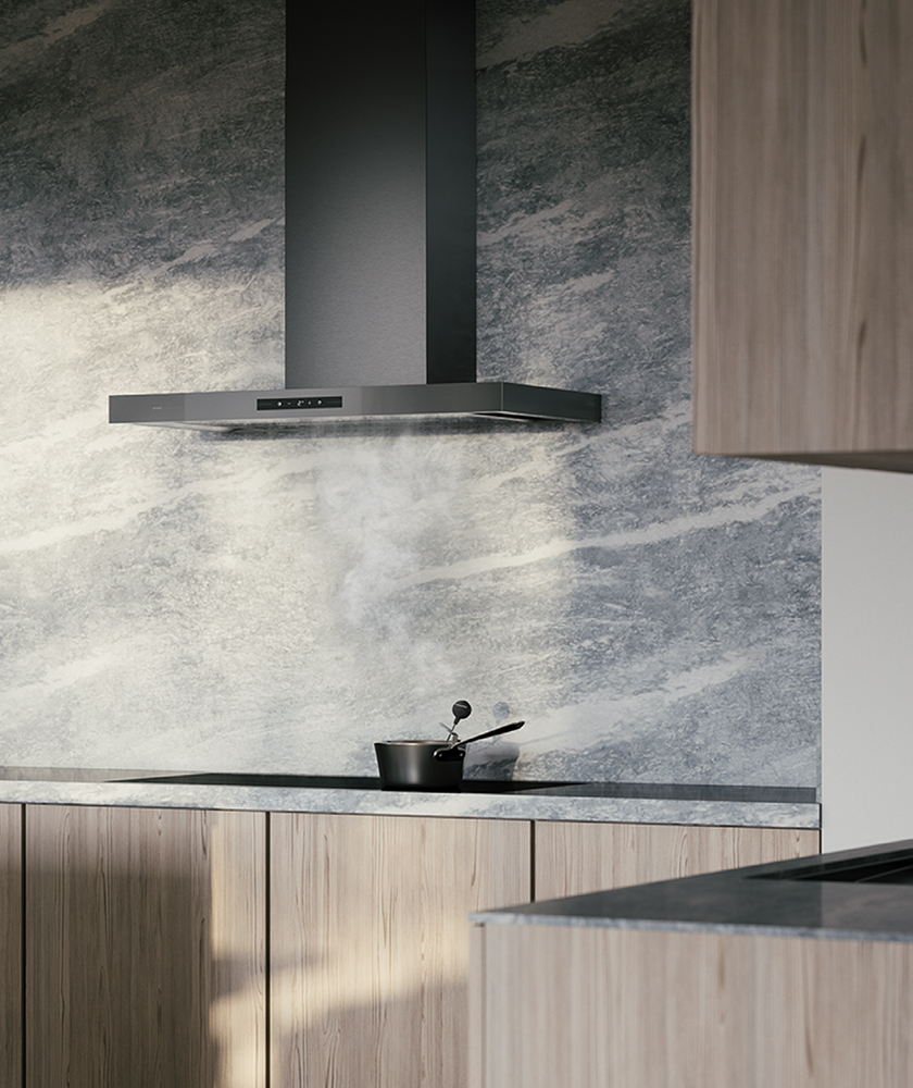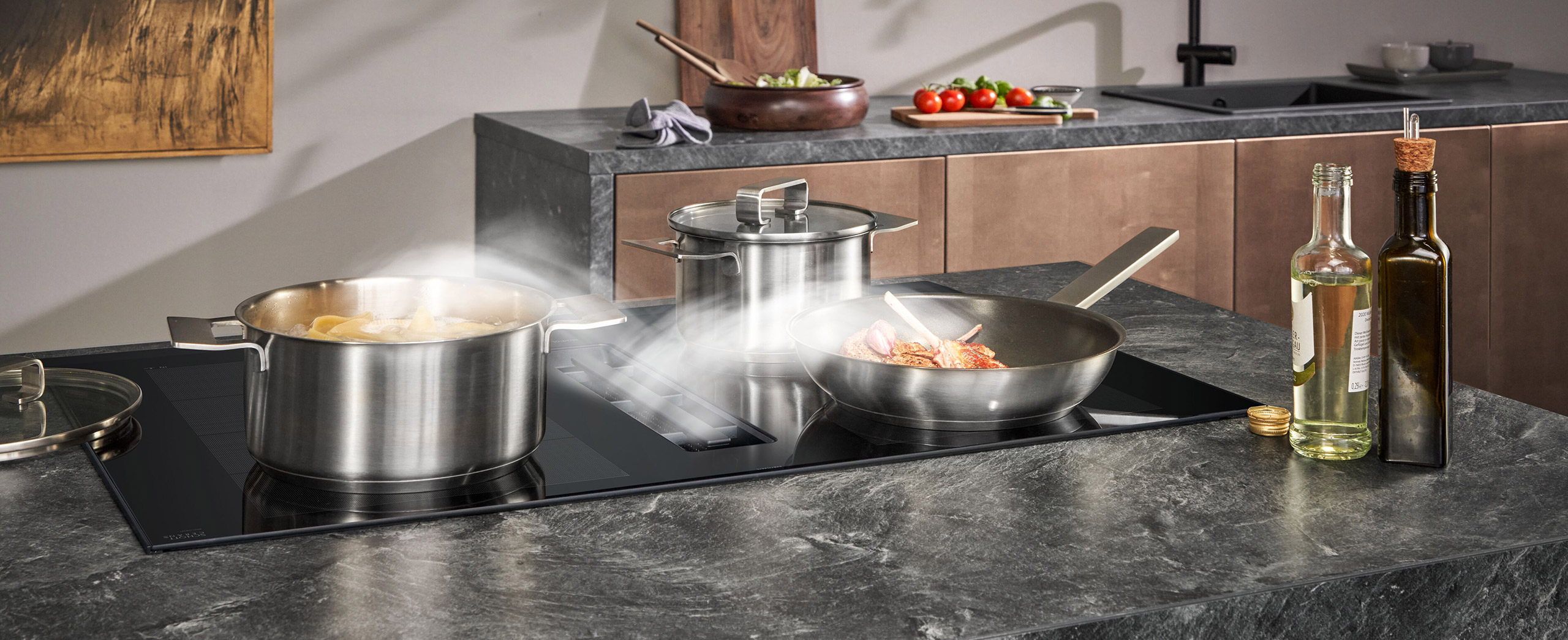 Een downdraft-afzuigsysteem is bijna onzichtbaar wanneer het niet in gebruik is. Het is ideaal voor kookeilanden en kan zowel bij gas als inductie worden toegepast. Wanneer u het systeem inschakelt, komt de afzuigunit omhoog uit het werkblad om kookdampen direct bij de pan af te zuigen. Staat het apparaat uit, dan verdwijnt het weer volledig in het werkblad en blijft alleen een subtiel bedieningspaneel zichtbaar.
