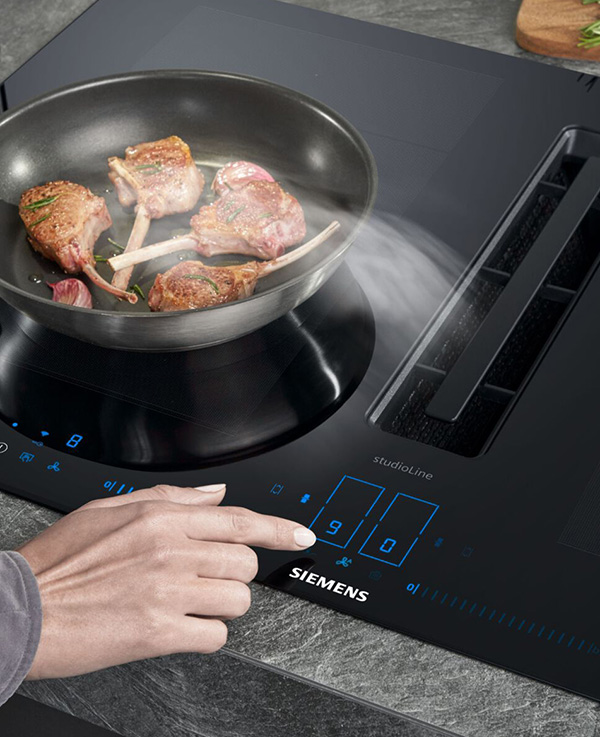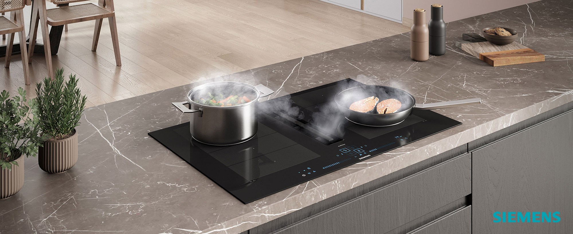 De revolutionaire Siemens inductionAir Plus combineert twee geweldige apparaten: een inductiekookplaat met flexibele kookzones en een krachtige werkbladafzuiging. Het ruimtebesparende concept biedt alle mogelijkheden om de keuken van je dromen te creëren. De volledig strakke kookplaat is zelfs in te passen in een zwevend werkblad, en de geïntegreerde afzuiging zorgt ervoor dat je vrij zicht houdt boven het werkblad. Perfect als je houdt van een open ruimte en een strak design.