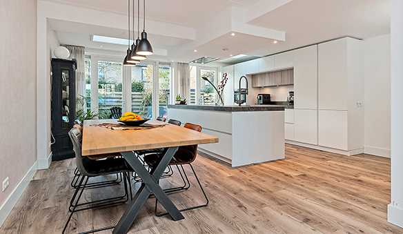 Paul (35) en Sacha (32) hebben samen hun eerste huis gekocht. Het is strak en modern ingericht, maar straalt warmte uit, ook in de keuken. “We vinden het belangrijk dat mensen zich hier welkom voelen.”